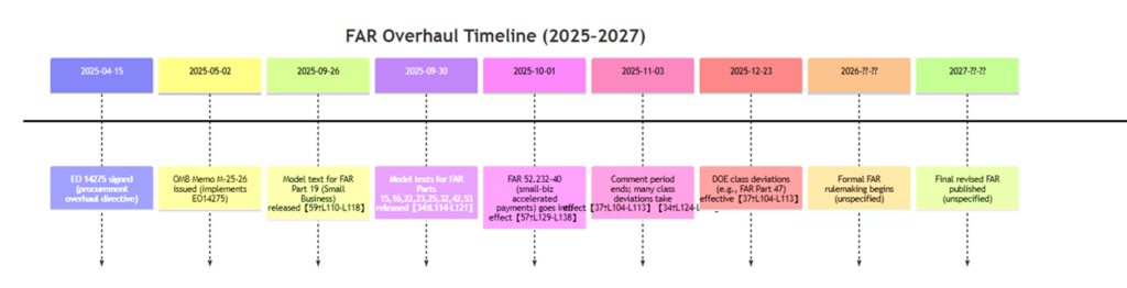 The transformation stems from EO 14275 (Apr 15, 2025) and OMB Memo M-25-26 (May 2025), which directed the FAR Council to excise non-essential provisions and rewrite regulations in plain language[1][9]. Key milestones include: