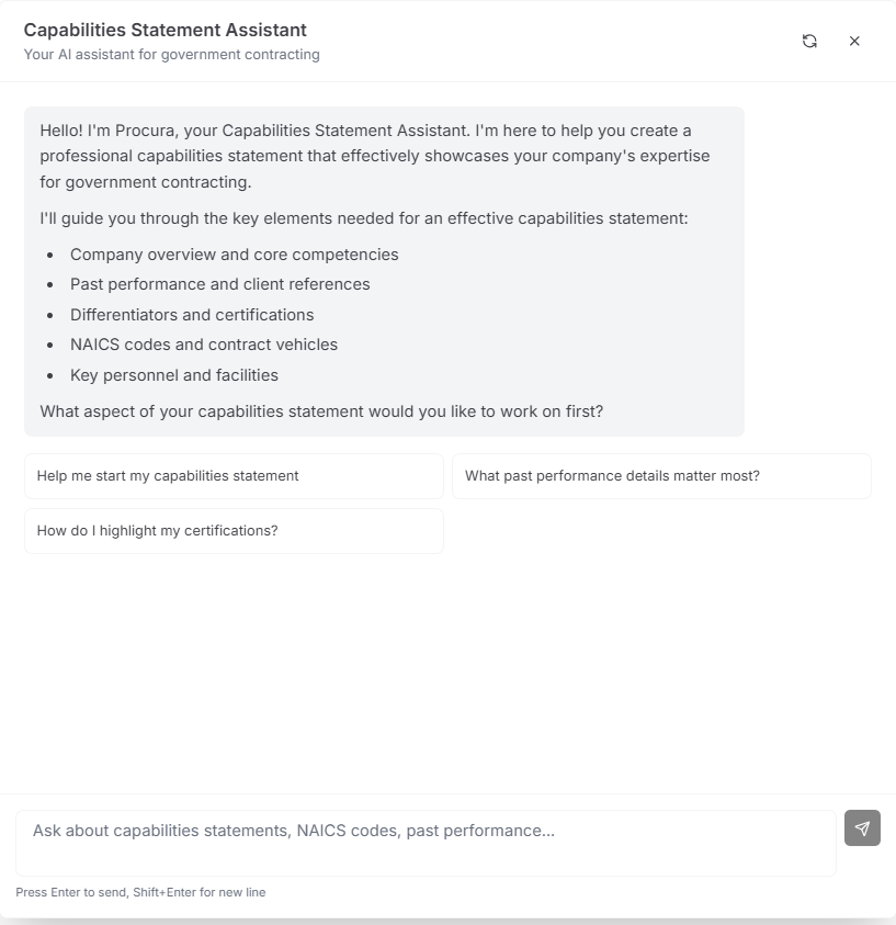 If you don’t have a polished capability statement yet, Procura includes an AI capability statement generator that asks targeted questions and produces a clean one-page draft (core competencies, differentiators, past performance, corporate data). We built it around common federal best practices and evaluation concepts so you can get to a strong “first version” fast. [8]