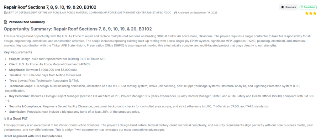 | For subs: use summaries to craft targeted outreach to primes | Converts analysis into specific, credible teaming conversations | “Why this fits” and subcontracting lead screening [19] |