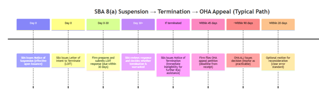 | SBA internal review/decision | SBA considers response and decides whether termination is warranted | No fixed number of days; SBA says it will act “timely” | Uncertainty window; protect pipeline, teaming, and staffing plans [11] |